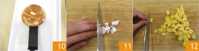 Transférez le pancake sur un plateau 10 et continuez ainsi jusqu'à épuisement de la pâte, en les empilant les uns sur les autres ; avec ces quantités, vous devriez obtenir environ 12 pancakes. Une fois prêts, coupez la noix de coco en morceaux 11 et l'ananas en cubes 12.