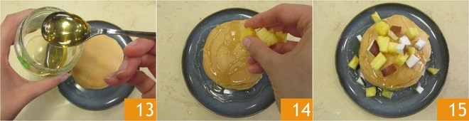 Arrosez les pancakes de miel d'acacia 13 et garnissez-les avec les morceaux de fruits 14. Vos pancakes à la noix de coco sont prêts à être dégustés 15 !
