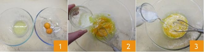 Pour préparer les pancakes bicolores, commencez par la base : faites fondre le beurre à feu très doux, puis laissez tiédir. Pendant ce temps, séparez les blancs des jaunes d'œufs 1. Versez les jaunes dans un bol et battez-les avec un fouet, puis ajoutez le beurre fondu et tiédi 2 et le lait en filet 3.