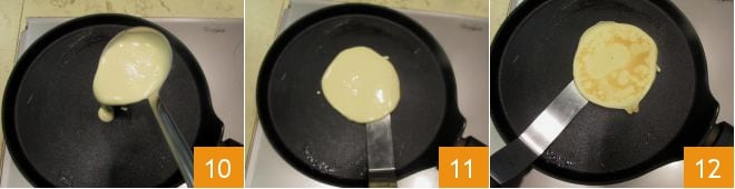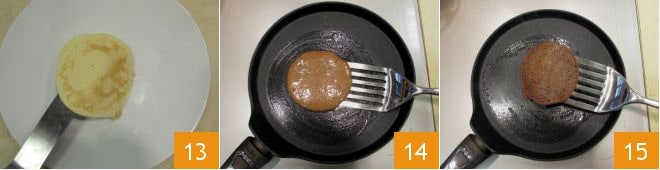 Commencez par les pancakes clairs : au centre de la poêle, versez une petite louche de préparation 10, il n'y aura pas besoin de l'étaler. Dès que des petites bulles apparaissent à la surface, retournez le pancake 11 et faites cuire de l'autre côté 12.