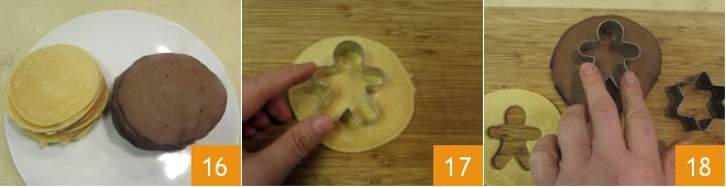 Une fois prêts 16, vous pouvez les couper avec des formes : découpez un pancake clair et un foncé avec la même forme (17-18)