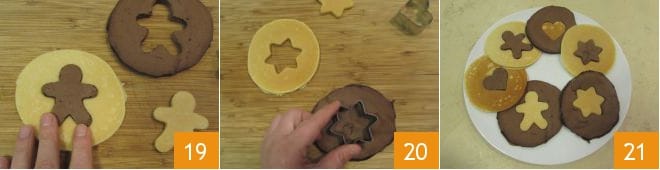 et insérez le bonhomme foncé obtenu dans le pancake clair 19, le bonhomme clair dans le pancake foncé. Poursuivez de la même manière avec d'autres formes à votre goût, une petite étoile par exemple 20, des sapins, des cœurs, des chaussettes de Noël... jusqu'à obtenir tous vos pancakes bicolores 21 à servir avec une abondante quantité de sirop d'érable!