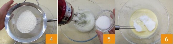 Montez le mélange jusqu'à ce qu'il soit clair. Ajoutez la levure à 100 g de farine en les tamisant 4 et mélangez le tout. Maintenant, montez les blancs d'œufs que vous avez mis de côté avec un batteur électrique, en ajoutant le sucre peu à peu 5 et lorsqu'ils seront blancs et mousseux incorporez-les délicatement au mélange d'œufs, avec une spatule en effectuant des mouvements de haut en bas, pour éviter de les faire retomber 6.
