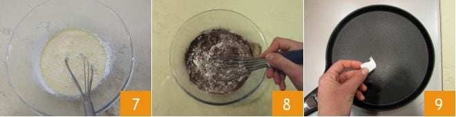 Maintenant, divisez la pâte en deux dans deux bols, dans l'un versez 25 g de farine et mélangez avec un fouet (ou avec la spatule) 7, dans l'autre 15 g de cacao en poudre 8. Faites chauffer à feu moyen (pas trop fort sinon vous n'accorderez pas le temps à la pâte de bien lever pendant la cuisson et les pancakes deviendront trop foncés) une grande poêle antiadhésive (de préférence avec un fond épais) et graissez avec un peu de beurre à étaler sur la surface 9.