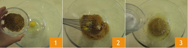 Pour préparer les pancakes légers, commencez par verser dans un bol l'œuf et le sucre 1, mélangez rapidement avec un fouet manuel 2 puis ajoutez le lait de coco 3.