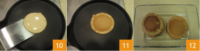 Quand vous verrez les petites bulles apparaître à la surface 10, retournez la crêpe et poursuivez la cuisson 11. Au fur et à mesure qu'ils sont prêts, placez les pancakes dans un récipient 12. Vous obtiendrez environ 12-14 pièces.