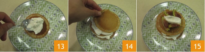 Quand vous aurez fini, vous pourrez passer à la garniture. Disposez une crêpe sur l'assiette et garnissez avec un peu de yaourt grec 13, répétez l'opération et sur la dernière couche, mettez la troisième crêpe 14. Garnissez la surface avec encore un peu de yaourt grec, une demi-cuillère à café de miel et quelques morceaux de figue coupés en quartiers. Vos pancakes légers sont prêts 15.