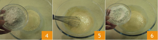 À ce stade, vous pouvez incorporer la farine de petit épeautre 4, en mélangeant encore avec le fouet pour éviter de former des grumeaux 5 et enfin la farine 00 6.