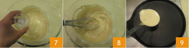 Enfin, incorporez la levure chimique 7 et vous obtiendrez ainsi une pâte lisse et homogène 8. Chauffez une crêpière antiadhésive ou une petite poêle (toujours antiadhésive) et versez une paire de louches 9.