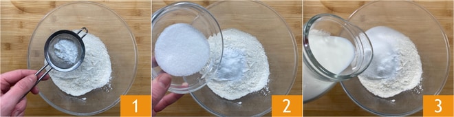 Pour réaliser les pancakes sans œufs, commencez par faire fondre le beurre dans une petite casserole et laissez tiédir. Entre-temps, tamisez la farine dans un bol et tamisez ensuite la levure dans le même bol 1. Ajoutez le sucre 2 et le lait 3.