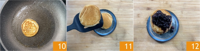 Cuisez pendant une minute de l'autre côté 10; le temps de cuisson total est d'environ 3 minutes pour chacun. Si vous le souhaitez, vous pouvez également les faire plus grands et ajuster les temps de cuisson en conséquence. Au fur et à mesure qu'ils sont cuits, empilez les pancakes sans œufs sur une assiette de service 11 et garnissez-les avec les ingrédients de votre choix 12, nous recommandons une petite sauce aux myrtilles, découvrez comment la préparer dans le conseil !