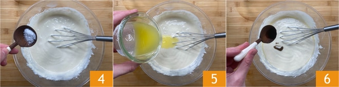 Incorporez le tout avec un fouet à main, puis ajoutez également le sel 4, le beurre fondu tiède 5 et l'extrait de vanille 6. Mélangez encore pour obtenir une pâte lisse et homogène.