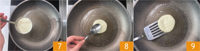 Chauffez une poêle antiadhésive à feu moyen-doux et graissez-la avec un peu de beurre, puis versez au centre une petite louche de pâte 7 et étalez-la légèrement avec le dos d'une cuillère pour la rendre ronde 8. Lorsque des bulles commencent à apparaître à la surface, retournez le pancake avec une spatule 9.