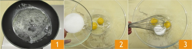 Pour préparer les pancakes à la ricotta, faites fondre le beurre à feu très doux (dans la même poêle antiadhésive où vous cuirez ensuite les pancakes) 1, laissez tiédir pendant le temps de préparation de la pâte. Dans un bol, cassez les œufs entiers, ajoutez le sucre 2 et battez pendant quelques minutes avec un fouet manuel 3,
