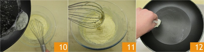 Incorporez délicatement le beurre désormais tiède 10, en travaillant la pâte le moins possible : vous obtiendrez une consistance assez dense 11, semblable à celle d'une pâte à gâteau. Ne vous inquiétez pas s'il y a des grumeaux, c'est normal. Passez la poêle avec un morceau de papier absorbant pour éliminer l'excès de beurre fondu 12.