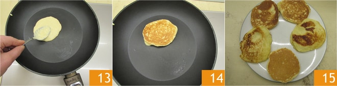 Faites chauffer à feu moyen et lorsqu'elle est chaude, placez au centre un couple de cuillères à soupe de pâte, en l'étalant légèrement avec le dos de la cuillère 13. Laissez cuire 3-4 minutes d'un côté, contrôlez la dorure de la base avant de retourner le pancake 14 : laissez cuire encore 1-2 minutes de l'autre côté. Mettez le pancake prêt sur l'assiette de service et continuez ainsi jusqu'à épuisement de la pâte. Vous obtiendrez 7-8 pancakes avec ces doses. Au fur et à mesure qu'ils sont prêts, déposez-les sans les superposer 15 : en évitant de les écraser, ils ne perdront pas leur moelleux. Seulement au moment de servir, empilez-les délicatement comme le veut la tradition. Accompagnez-les de yaourt, crème ou d'une sauce aux fruits rouges, de fruits frais ou du classique et délicieux sirop d'érable !