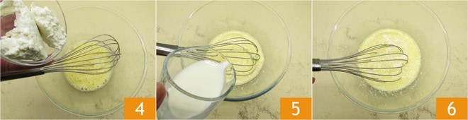 jusqu'à ce que le mélange soit légèrement mousseux; il ne doit pas être monté. Ajoutez la ricotta 4 et mélangez brièvement pour l'incorporer. Ensuite, versez le lait 5 et mélangez encore brièvement 6.