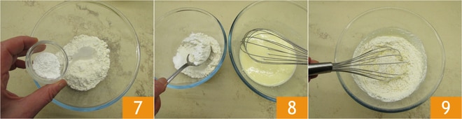 Tamisez à part la farine et la levure, ajoutez une pincée de sel 7. Versez ensuite les poudres petit à petit dans le mélange d'œufs 8, en mélangeant juste le temps nécessaire pour les faire absorber 9.