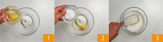 Pour préparer les pancakes au yaourt grec, commencez par mettre dans un bol le yaourt avec l'œuf 1 et le sucre 2. Mélangez ensuite avec un fouet à main jusqu'à ce que le tout soit bien amalgamé 3.