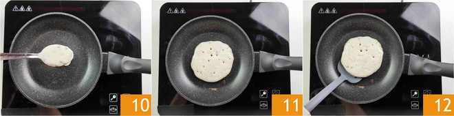 Chauffez à part une poêle antiadhésive d'un diamètre de 20 cm et, lorsqu'elle est bien chaude, versez 1 ou 2 cuillères de pâte 10 pour former un pancake d'environ 8 cm de diamètre 11. Dès que des bulles se forment, retournez le pancake avec une spatule 12.