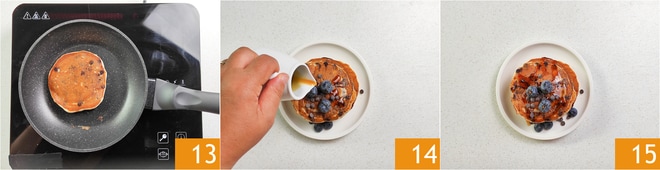 Poursuivez la cuisson de l'autre côté 13. Continuez ainsi jusqu'à épuiser tous les ingrédients ; avec ces quantités, vous en obtiendrez 10. Servez les pancakes au yaourt encore chauds, garnis de sirop d'érable ou de miel 14 15.