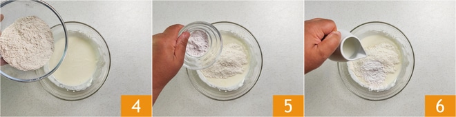 Ajoutez également la farine 4, la levure chimique tamisée 5 et le lait 6.