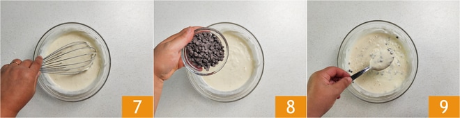 Mélangez à nouveau jusqu'à obtenir un mélange homogène et sans grumeaux 7. Ajoutez enfin les pépites de chocolat 8 et incorporez-les à la pâte 9.