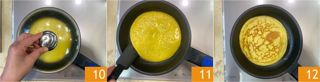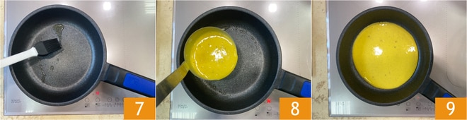 Maintenant, badigeonnez une petite poêle antiadhésive de 18 cm de diamètre avec de l'huile 7. Versez une louche de pâte 8 et tournez la poêle pour la répartir sur le fond 9.