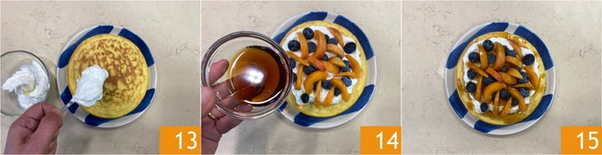 Une fois prêts, placez les pancakes sur un plat de service, étalez-les avec le yaourt grec 13, décorez avec des myrtilles et des tranches d'abricots, puis versez dessus du sirop d'érable à volonté 14. Les pancakes géants américains sont prêts, servez-les immédiatement 15.