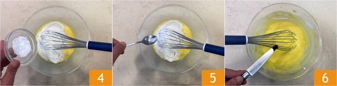 Pour préparer les pancakes géants américains, versez dans un bol les œufs et le lait 1, fouettez avec le fouet 2 pour mélanger les liquides, puis versez la farine 3.