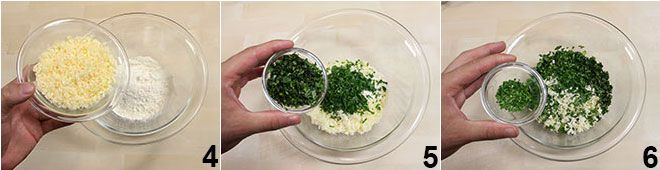 Dans un bol, mettez la farine et la levure chimique tamisées, ajoutez le fromage râpé 4 et une par une les herbes hachées : le persil, la ciboulette et le basilic (5-6).