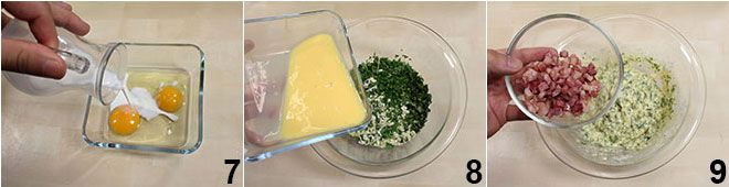 Dans un petit bol à part, battez les œufs avec le lait 7 et ajoutez le liquide obtenu dans le bol contenant les autres ingrédients secs 8. Mélangez bien jusqu'à obtenir une pâte douce et homogène, ajoutez les dés de lard rissolés 9, salez et poivrez et mélangez une dernière fois.