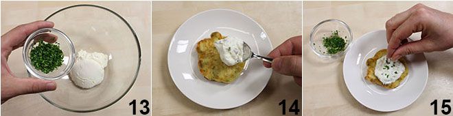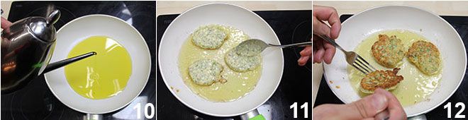 Dans une petite poêle antiadhésive, mettez 2 cuillères à soupe d'huile d'olive extra vierge 10 et chauffez-la sur le feu : prenez 3 cuillerées de pâte à la fois et disposez-les dans la poêle 11, formant 3 pancakes que vous cuirez des deux côtés jusqu'à ce qu'ils soient dorés 12. Retirez les pancakes de la poêle, égouttez-les sur du papier absorbant et gardez-les au chaud ; ajoutez une autre cuillère d'huile d'olive dans la poêle et faites frire les pancakes restants de la même manière.