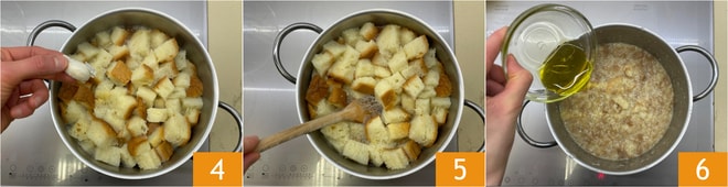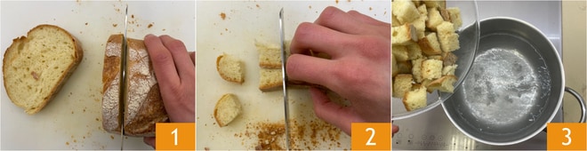 Pour préparer le pain cuit à la toscane, coupez d'abord le pain rassis en tranches 1 puis en cubes 2. Faites bouillir de l'eau dans une casserole, puis salez et ajoutez le pain 3.
