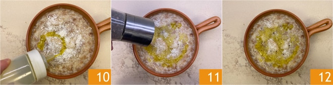 Enfin, complétez avec un filet d'huile 10 et un tour de moulin à poivre 11. Votre pain cuit est prêt à être dégusté 12!
