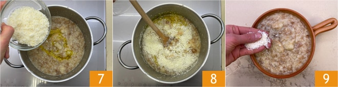 Assaisonnez avec le parmesan râpé 7 et mélangez une dernière fois 8. Servez et garnissez avec un peu plus de parmesan râpé 9.