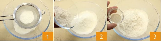 Pour réaliser le pain au pâté d'olives, commencez par préparer la pâte : tamisez la farine manitoba dans un grand bol 1, ajoutez la farine de petit épeautre 2, la levure de boulanger sèche 3, le malt et mélangez le tout. Vous pouvez également utiliser de la levure de boulanger fraîche (dans ce cas, la dose est de 12 g) et, à la place du malt, une cuillère à café de sucre.