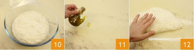 Lorsque la pâte est bien levée 10, huilez avec de l'huile d'olive un plan de travail 11 et transférez le pain dessus 12, ainsi il ne collera pas.