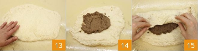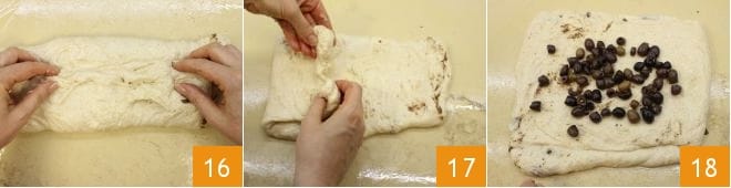 Aplatissez la pâte : étendez-la en un rectangle 13 et garnissez-la avec le pâté d'olives, en l'étalant à l'intérieur et en laissant quelques centimètres du bord 14, superposez les côtés longs (15-16),