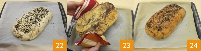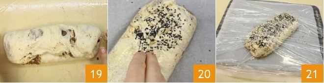 puis enroulez la pâte du côté long et repliez les côtés les plus courts 19, pour finir, étendez-la pour lui donner la forme d'un pain, en scellant bien les bords, les plis sont importants car ils donnent la bonne poussée à la levée. Déposez le pain sur une plaque de cuisson recouverte de papier sulfurisé, badigeonnez le pain d'un peu d'huile et répartissez dessus les graines de tournesol et de sésame noir 20. Couvrez avec un film plastique 21 et laissez lever 1 heure dans le four éteint avec la lumière allumée.