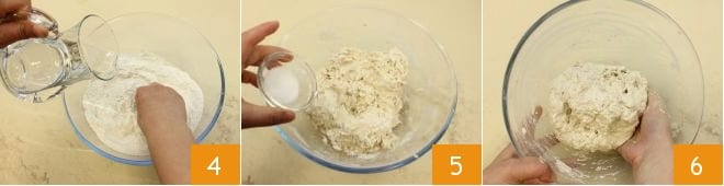 Ajoutez progressivement l'eau 4 et commencez à rassembler les ingrédients avec les mains, à la fin ajoutez le sel à la pâte 5. Transférez la pâte sur le plan de travail 6