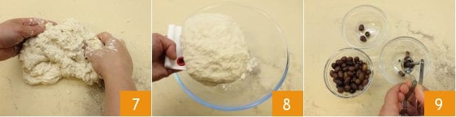 continuez à pétrir avec une corne car la pâte sera assez collante 7. Continuez jusqu'à ce qu'elle devienne lisse et douce. Mettez la pâte dans un bol légèrement huilé au fond 8, couvrez avec un film plastique et laissez lever dans le four éteint avec la lumière allumée pour créer une ambiance tiède pendant 2 heures. Dénoyautez les olives Taggiasca avec l'ustensile approprié 9 ou patiemment avec un couteau, vous pouvez récupérer la pulpe autour du noyau.