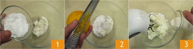 Pour réaliser le panettone farci avec crème et mascarpone, commencez par préparer la crème : mettez le mascarpone et le sucre glace dans un bol 1, ajoutez le zeste râpé de l'orange 2 et commencez à travailler avec un mixeur électrique. Ajoutez la crème tout en gardant le mixeur en marche 3.