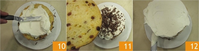 Étalez une autre couche de crème 10 et ajoutez d'autres éclats de chocolat, puis recouvrez avec la troisième tranche de panettone 11. À ce stade, répartissez la crème restante sur toute la surface du panettone 12.