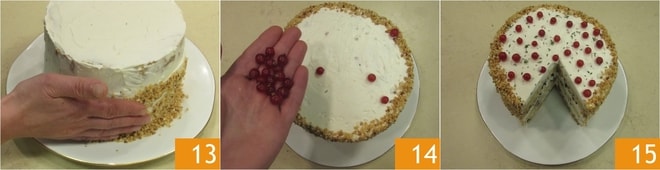 Décorez les côtés avec les éclats de noisettes, jusqu'au bord supérieur 13. Enfin, garnissez avec les groseilles 14 et quelques petites feuilles de thym. Votre panettone farci avec crème et mascarpone est prêt à être servi 15 !