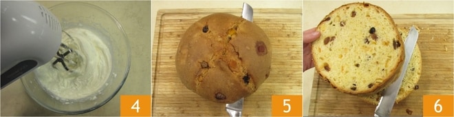 Vous devez obtenir une crème douce et homogène 4. Prenez le panettone et retirez le dessus 5, puis coupez-le horizontalement en 3 tranches de même épaisseur 6.