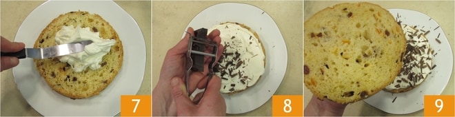 Placez la première tranche sur un plat de service et étalez une couche de crème avec une spatule 7, puis ajoutez des éclats de chocolat obtenus avec un éplucheur 8. Posez la deuxième tranche de panettone 9.
