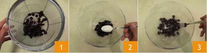 Égouttez les griottes 1, il vous en faudra 150 g. Farinez-les avec 15 g de farine 2 et mélangez 3. Cassez grossièrement le chocolat noir et mettez-le de côté.