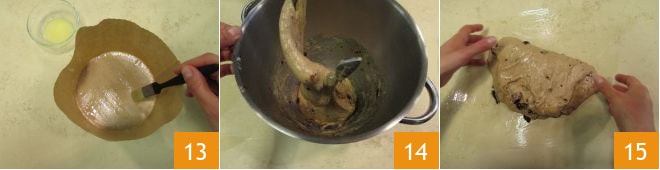 Entre-temps, beurrez un moule haut pour panettone, d'une capacité de 750 g. Une fois les 10 minutes passées, actionnez à nouveau la machine et travaillez la pâte pendant encore 10 minutes, jusqu'à ce qu'elle soit lisse et accrochée au crochet 14. Transférez la pâte sur un plan huilé et travaillez-la rapidement avec les mains 15.