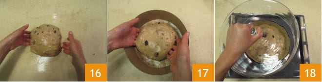 Puis boulez-la pour lui donner une forme sphérique 16 et placez-la dans le moule à panettone 17. Couvrez avec une cloche en verre (ou autre chose qui ne compromet pas la pousse du panettone). Laissez reposer pendant 2 heures à température ambiante, puis transférez au réfrigérateur et laissez maturer pendant 15 heures. Passé ce temps, laissez le panettone à température ambiante pendant encore 4 heures, toujours bien couvert. Ensuite, découvrez-le et attendez encore deux heures, de cette façon il sèchera légèrement en surface.